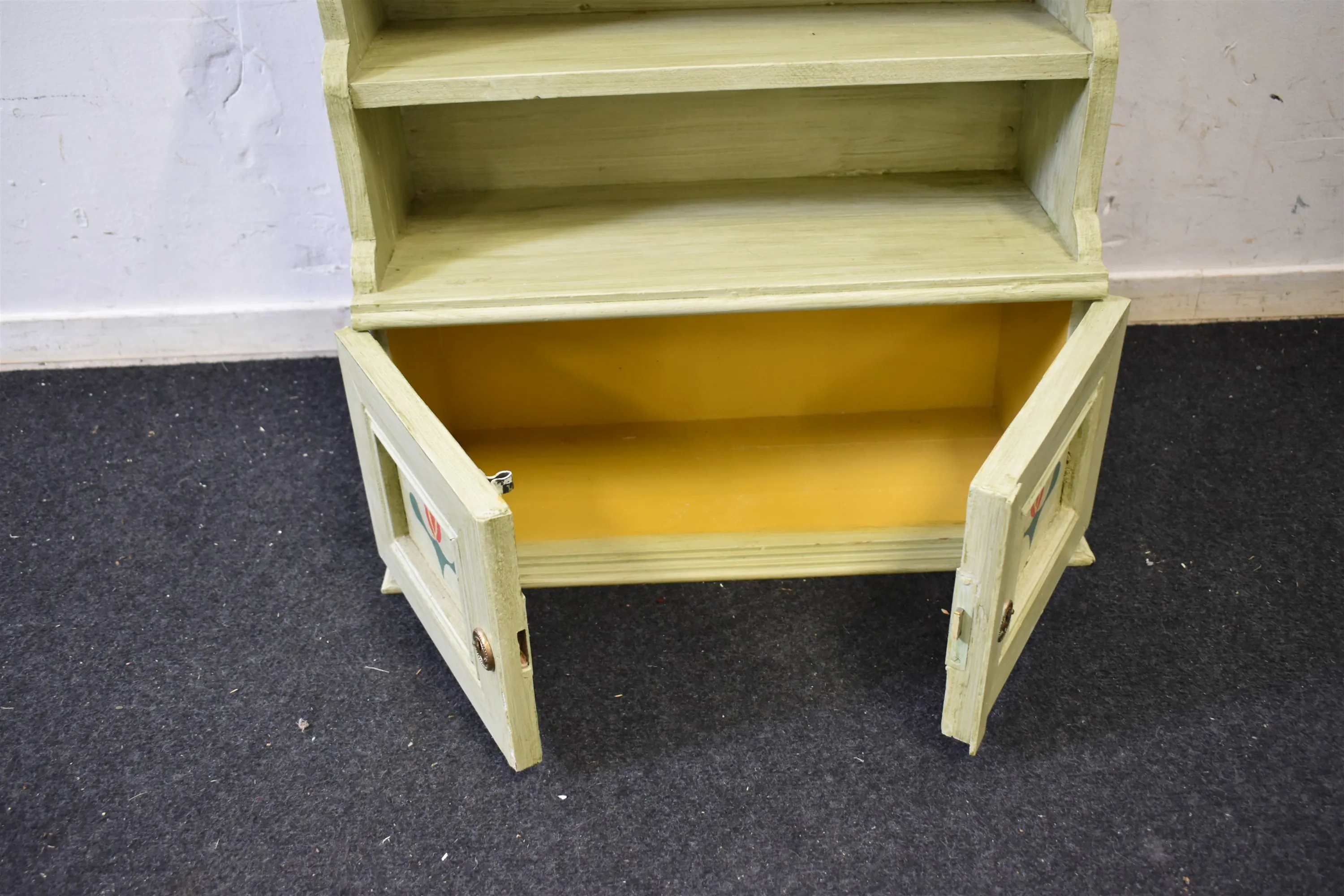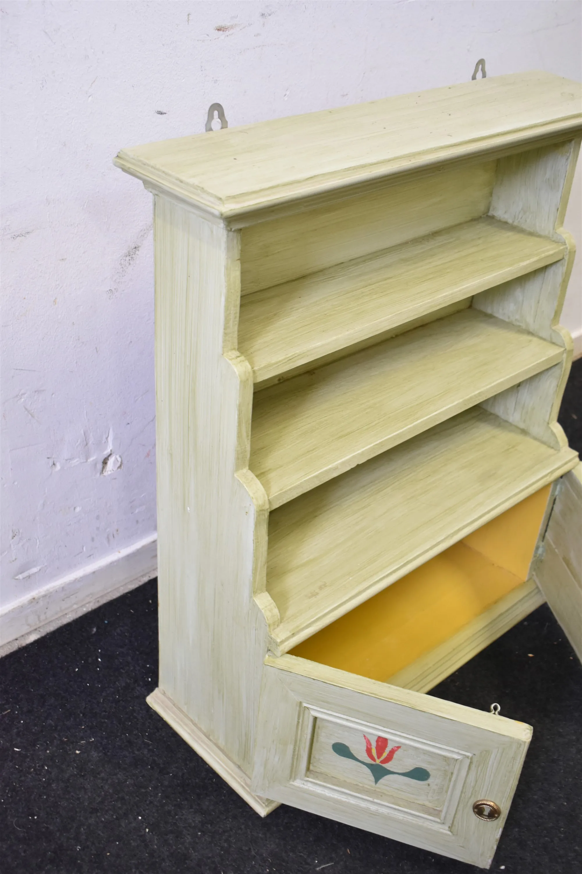 13612. Vägghängd hylla med skåp, nyckel saknas, höjd 70 cm, bredd 62 cm, djup 21 cm