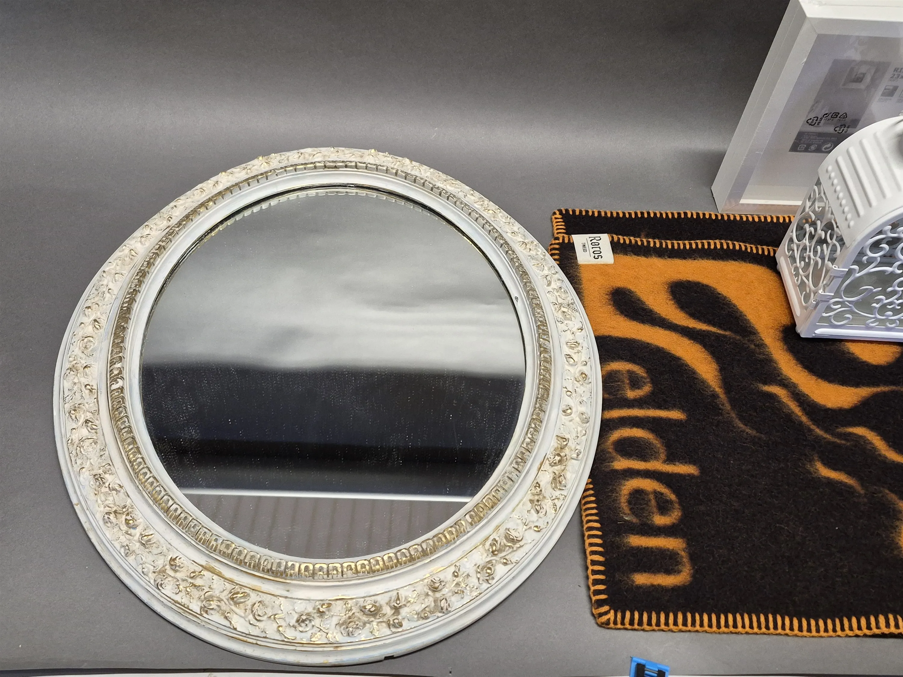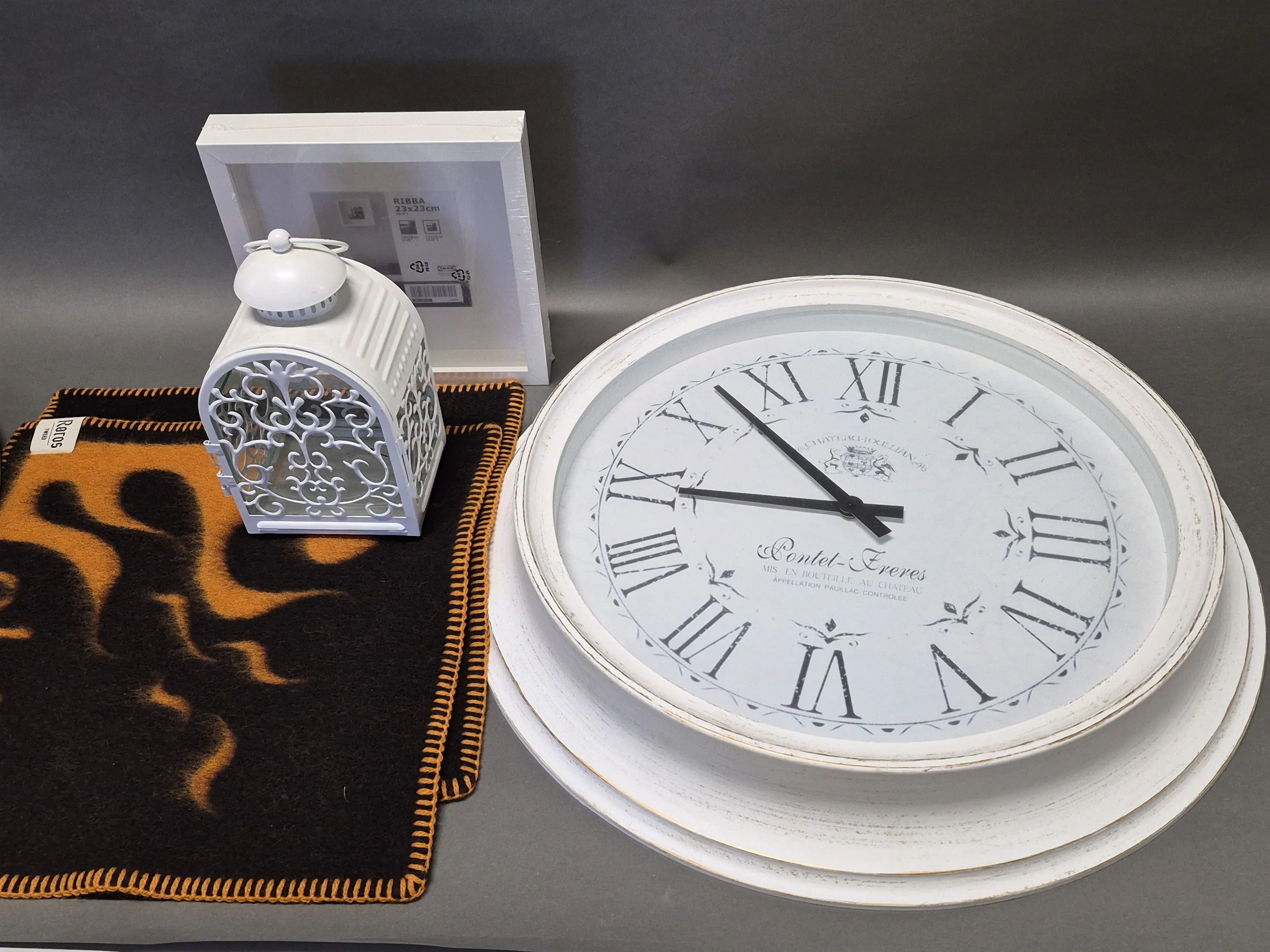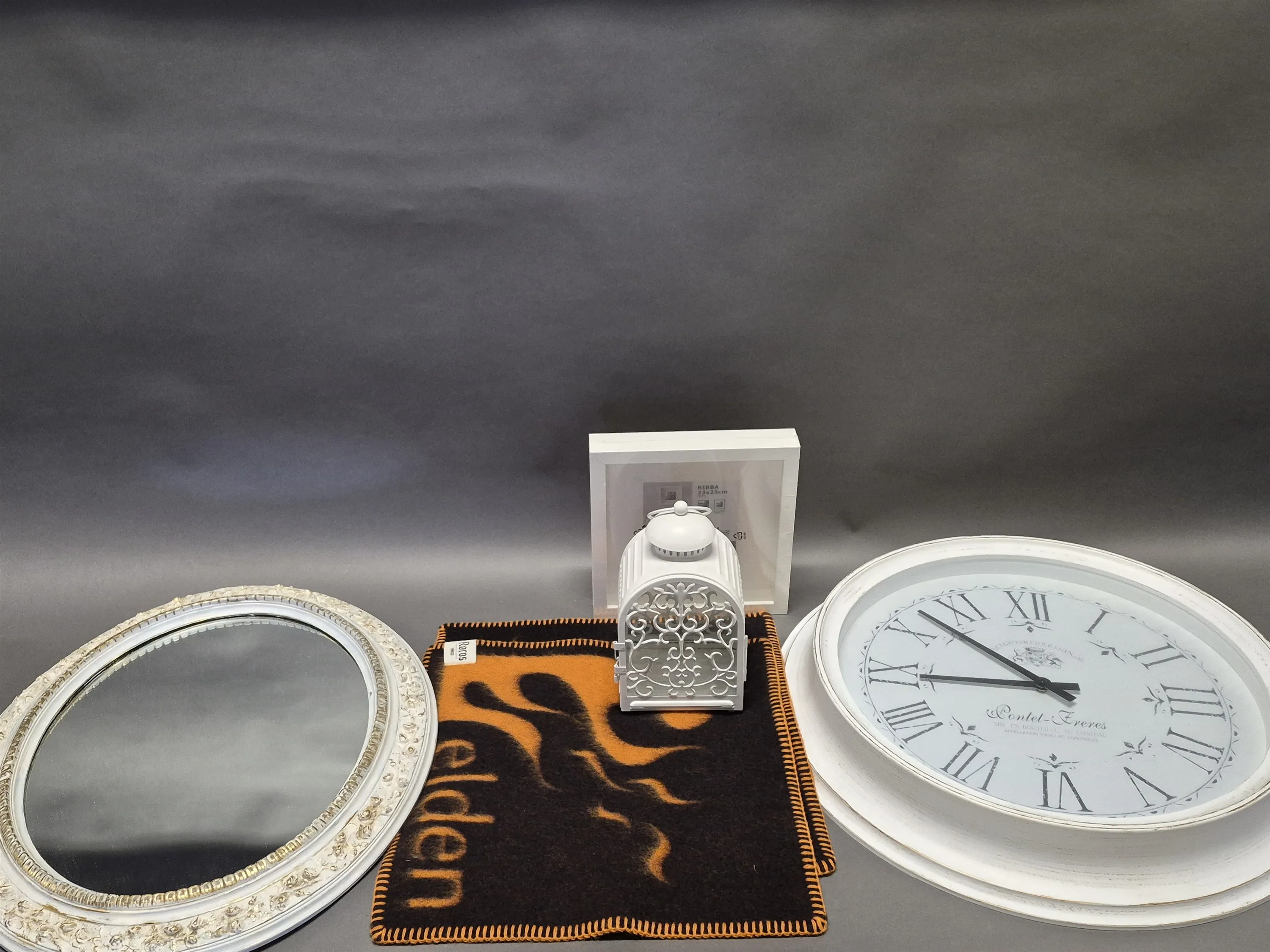 19143. Väggklocka, lykta & spegel, ram & sittlappar längsta 60 cm