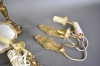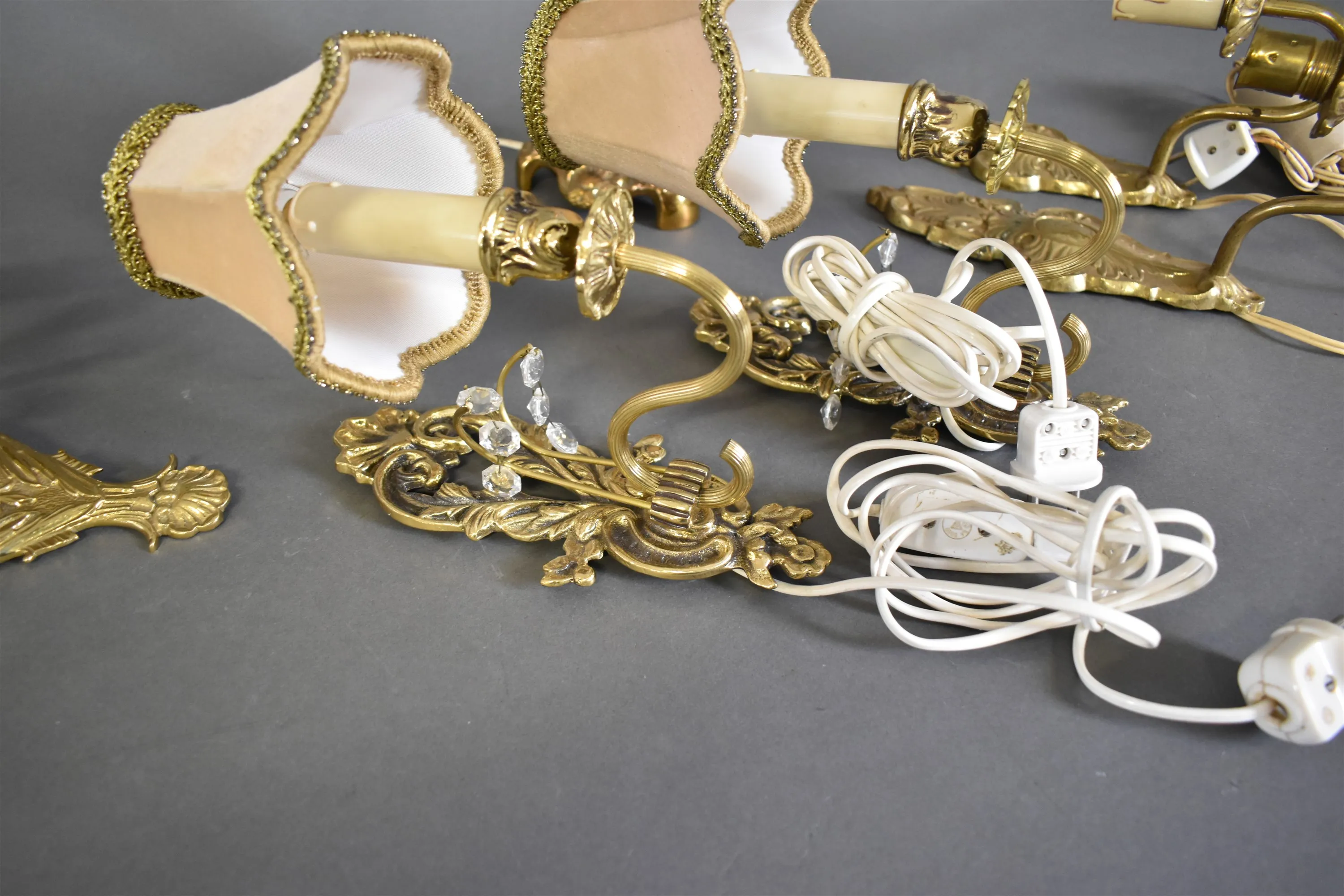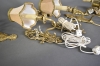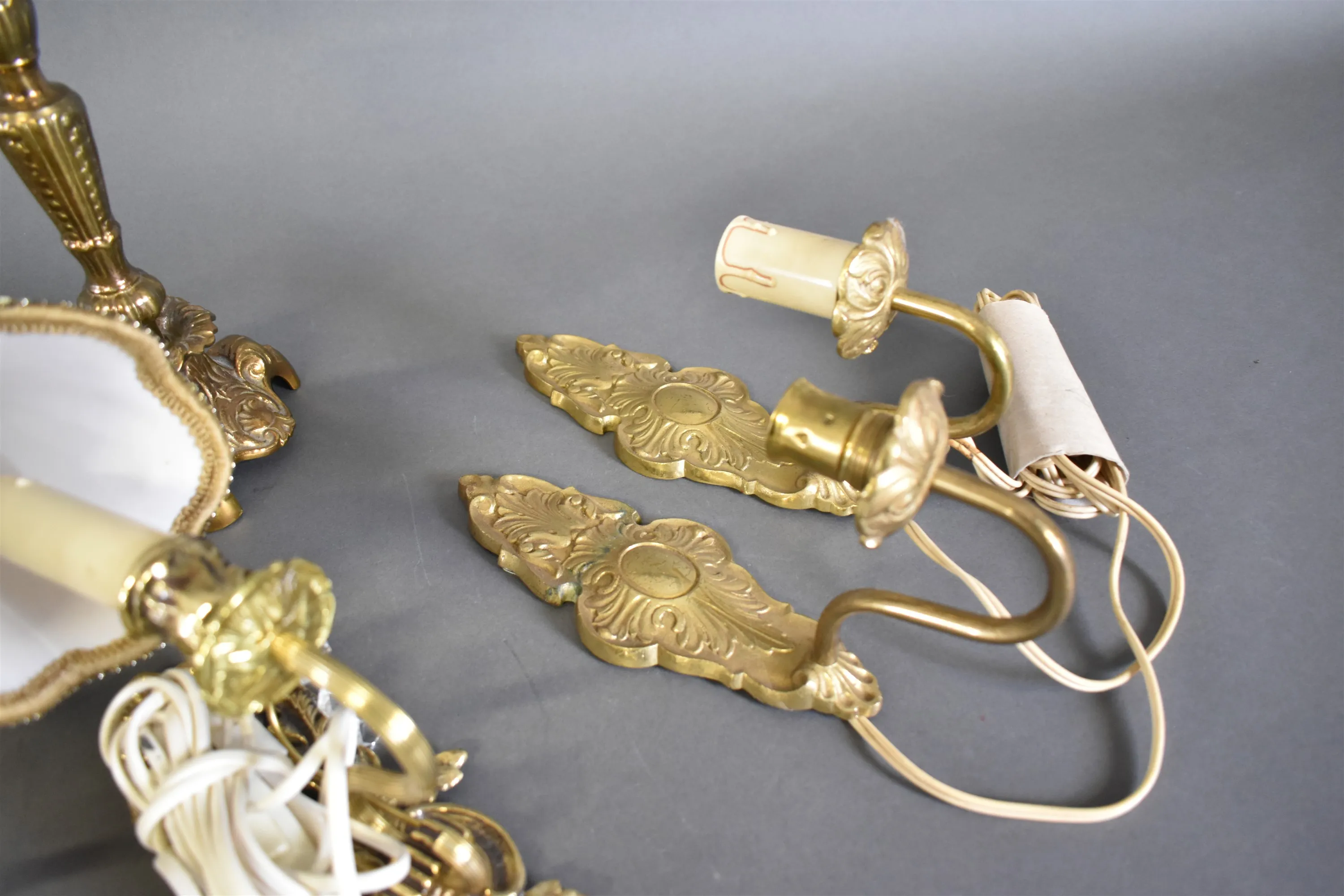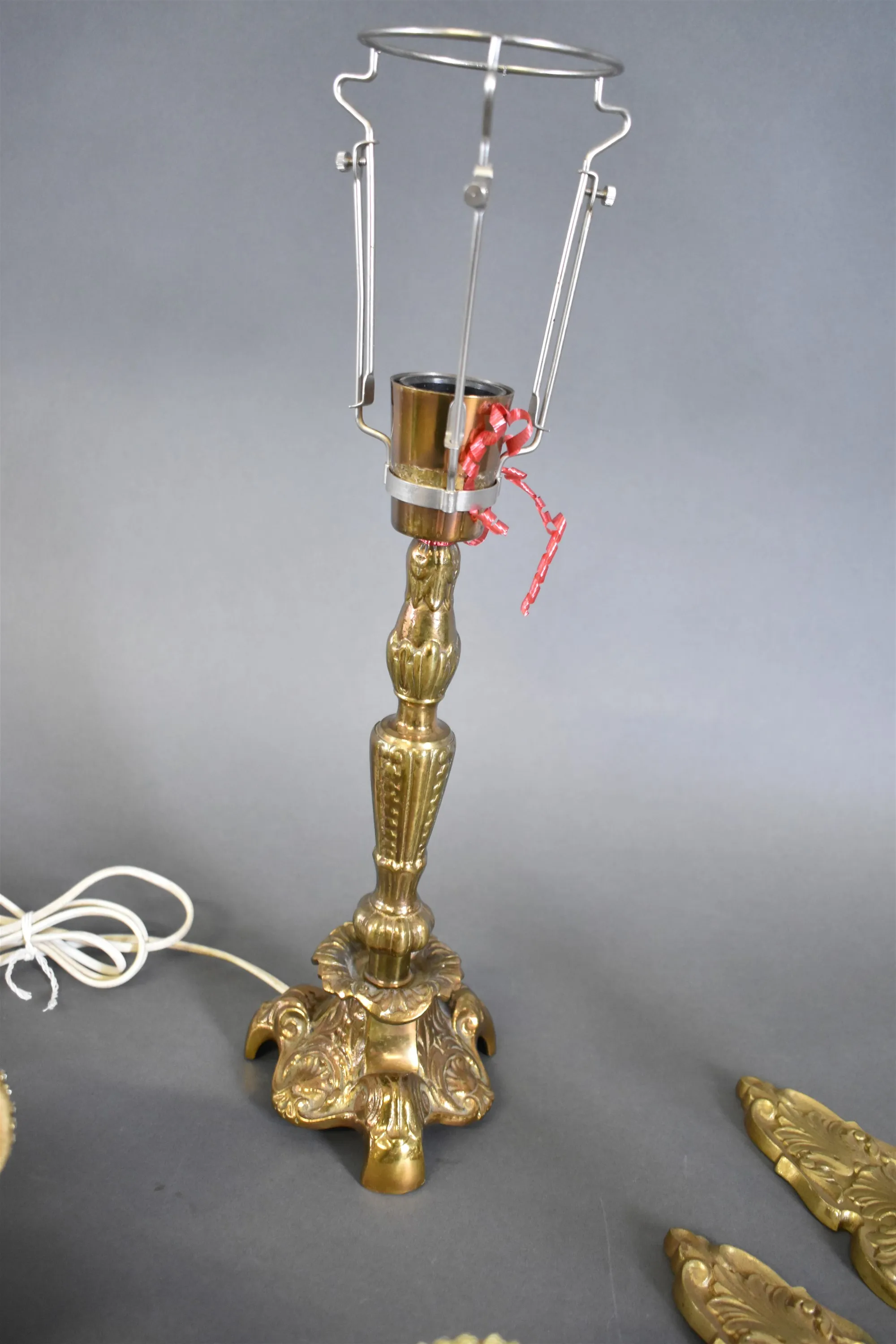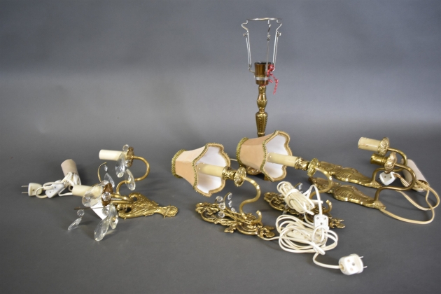 15086. Vägglampetter och bordslampa, mässing, högsta höjd 45 cm