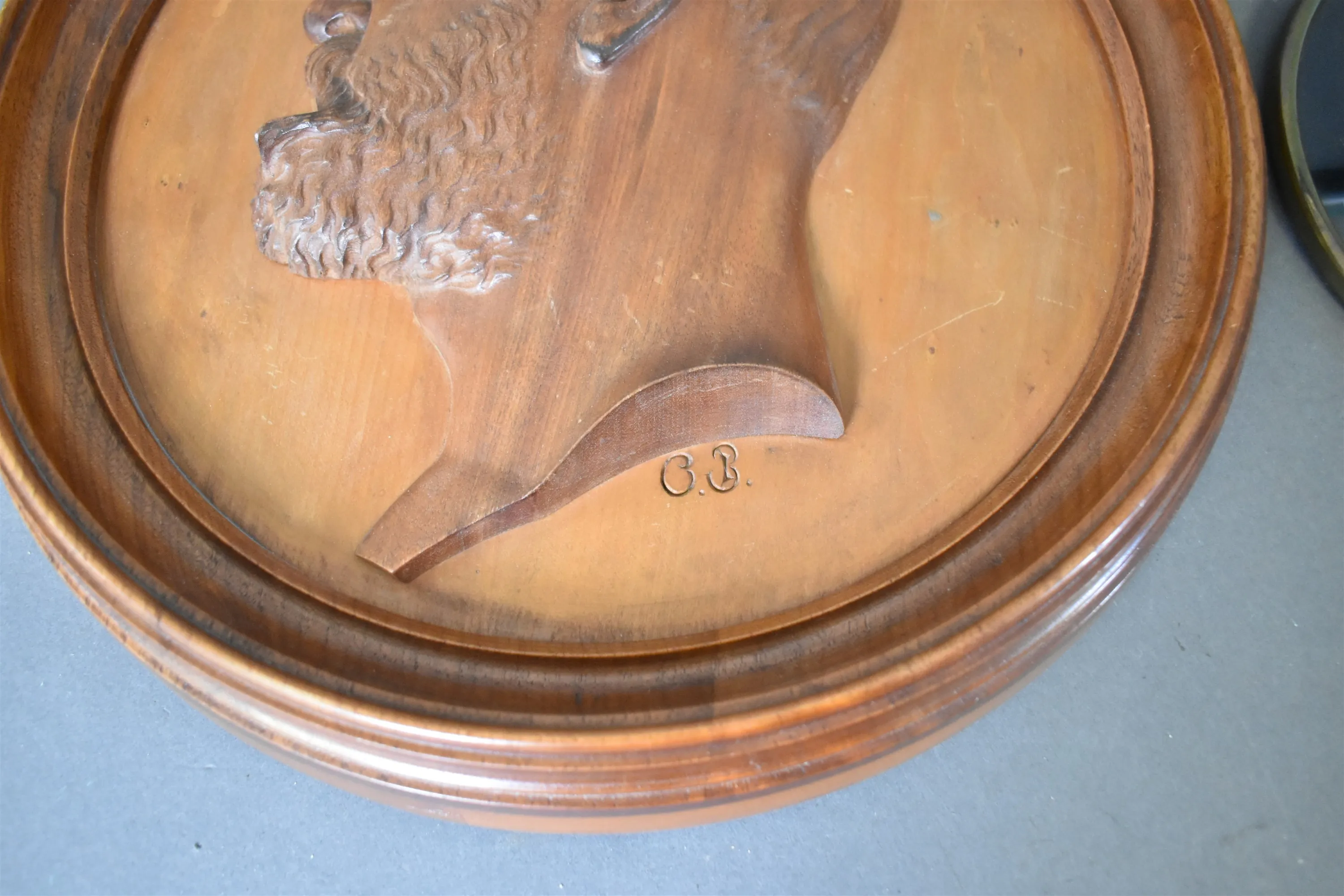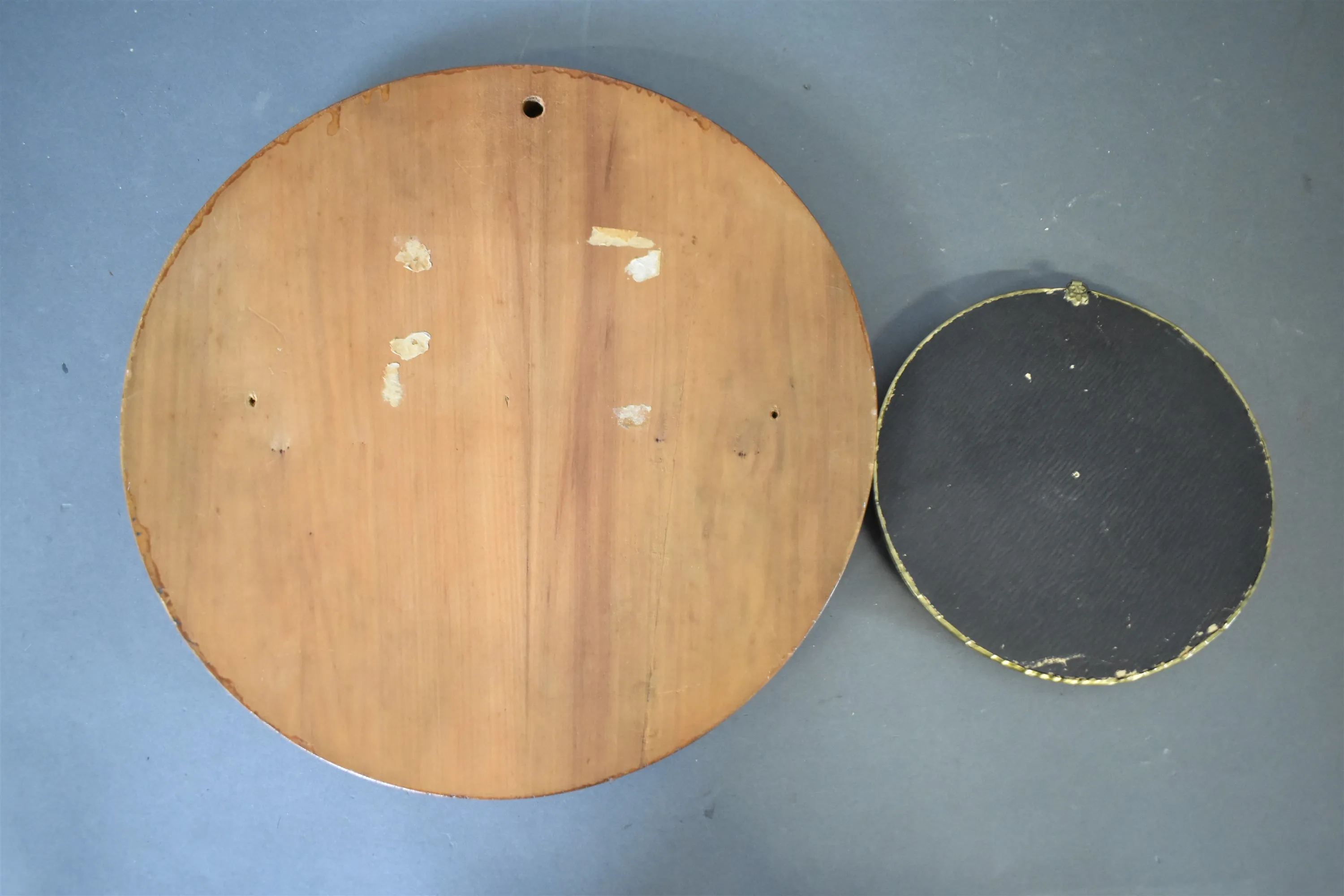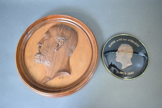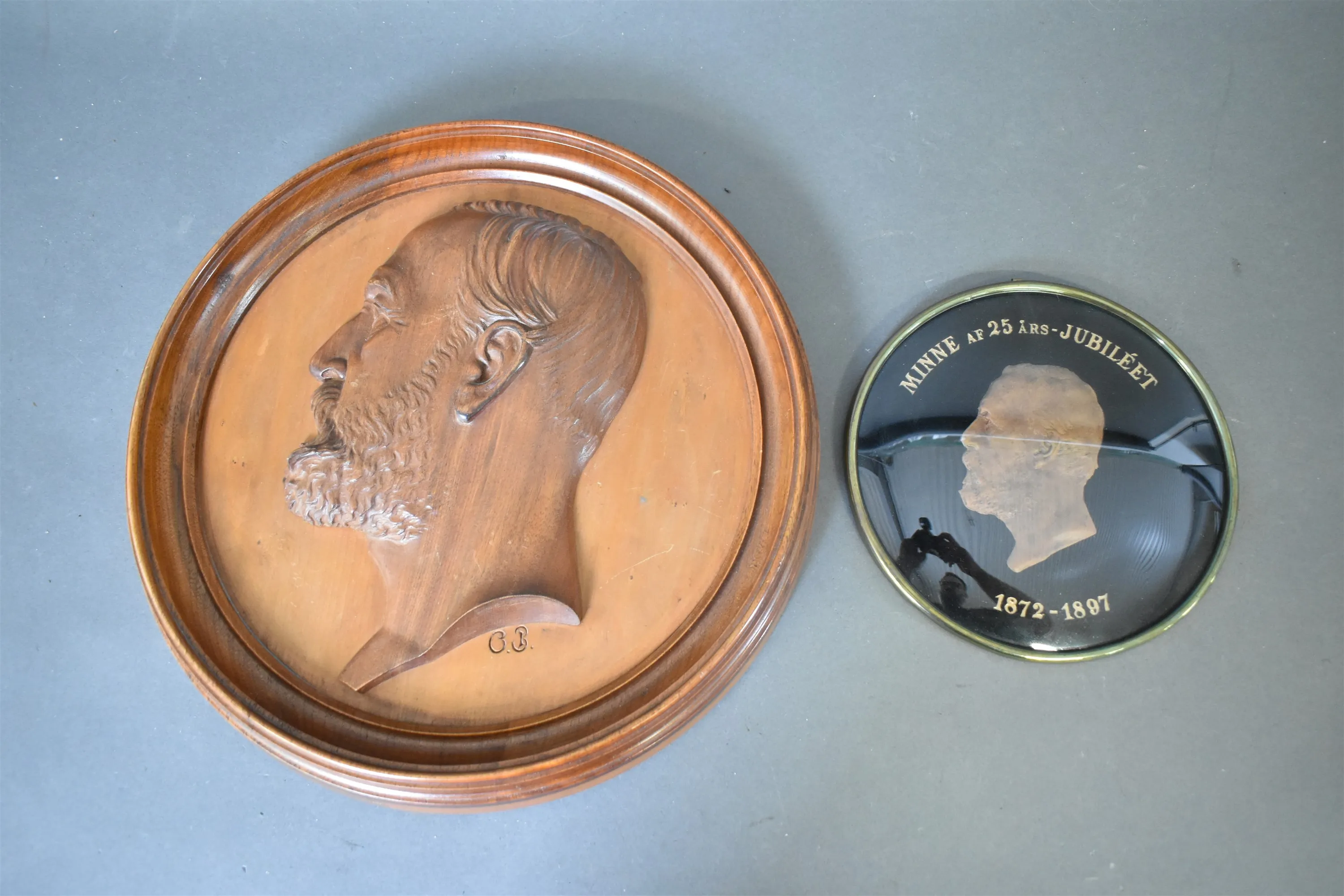 13269. Väggtavlor 2 st bl.a i trä, Oskar II Motiv, diameter på största 30 cm