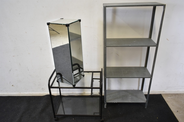 15963. Vagn med glasskivor, piedestal spegelglas & lagerhylla, höjd 140 cm