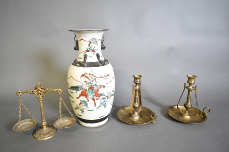 4013. Vas i asiatisk stil, skeppsljusstakar 1 par och våg, mässing, högsta höjd 35 cm