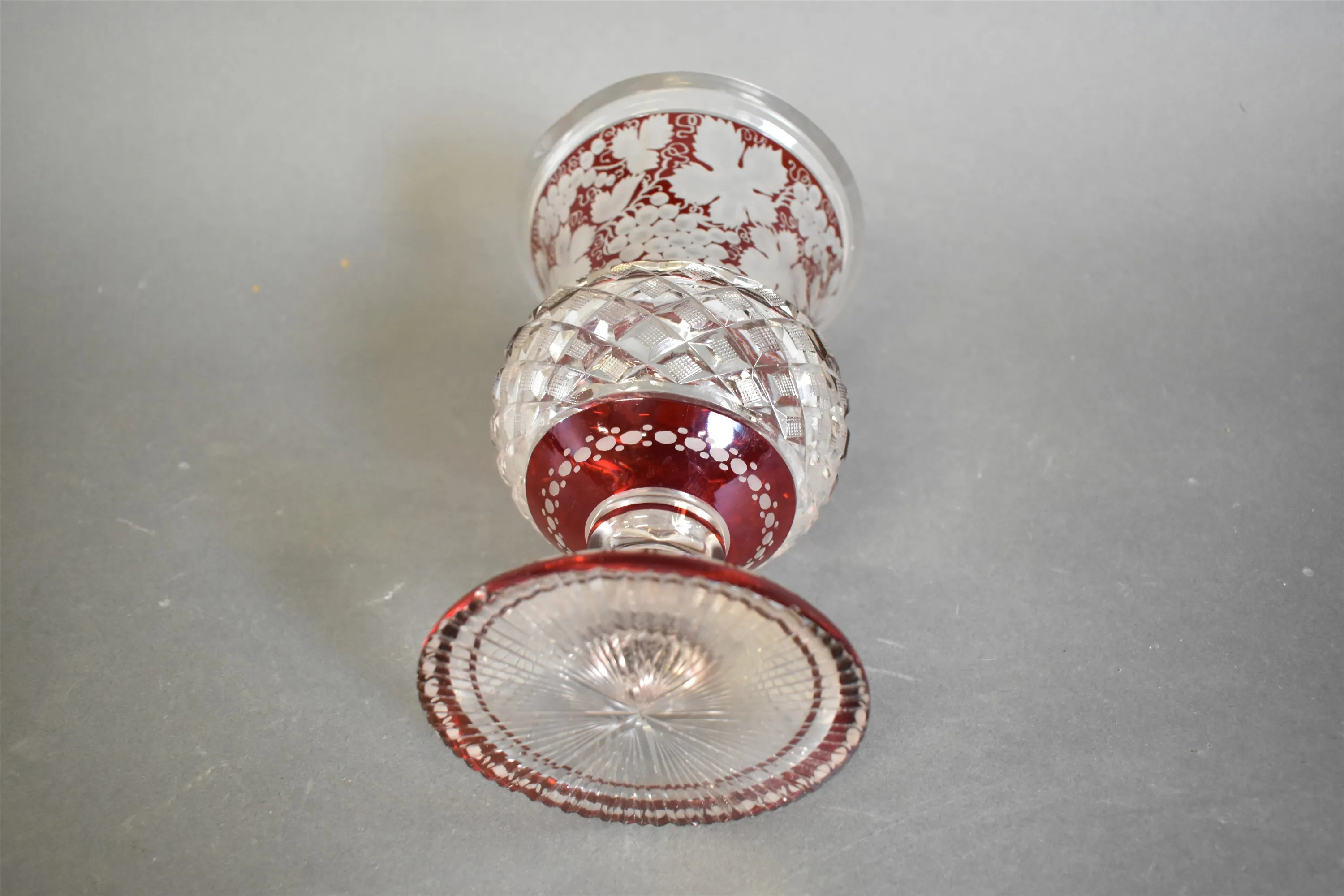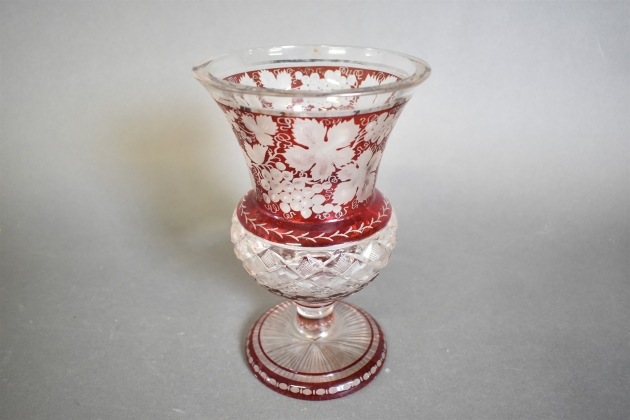 12122. Vas, urna, röd ton med slipad dekor, höjd 23 cm