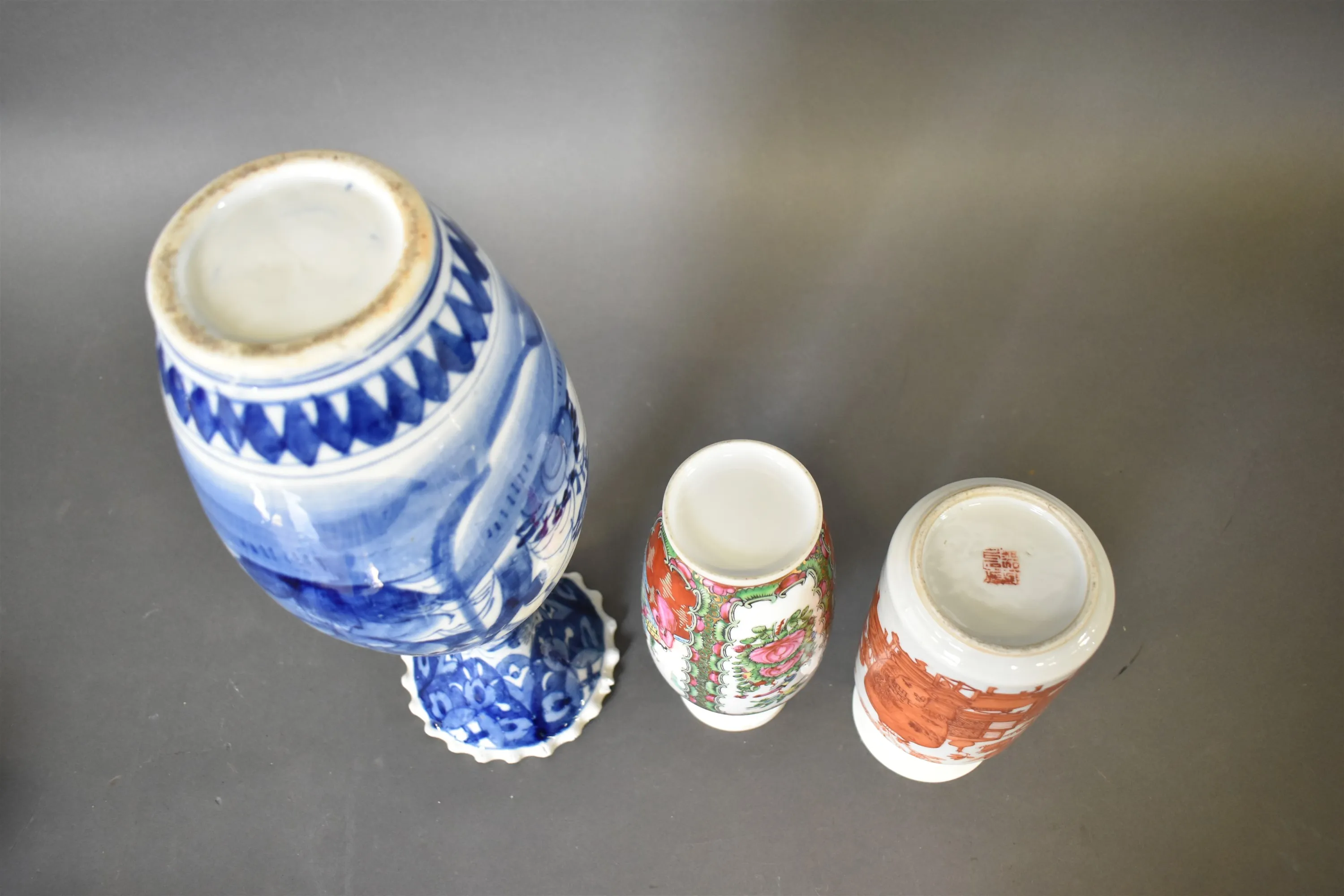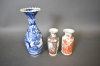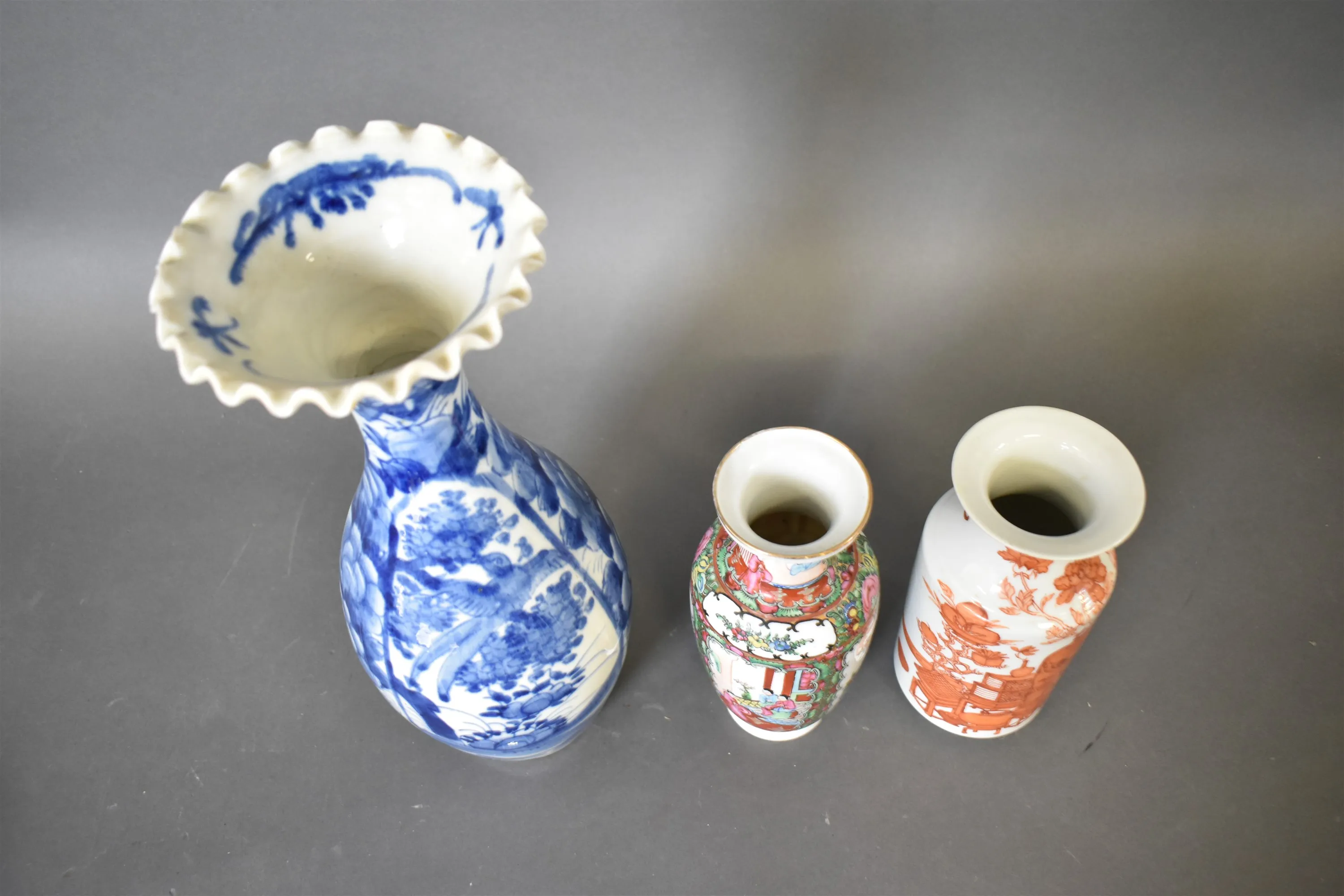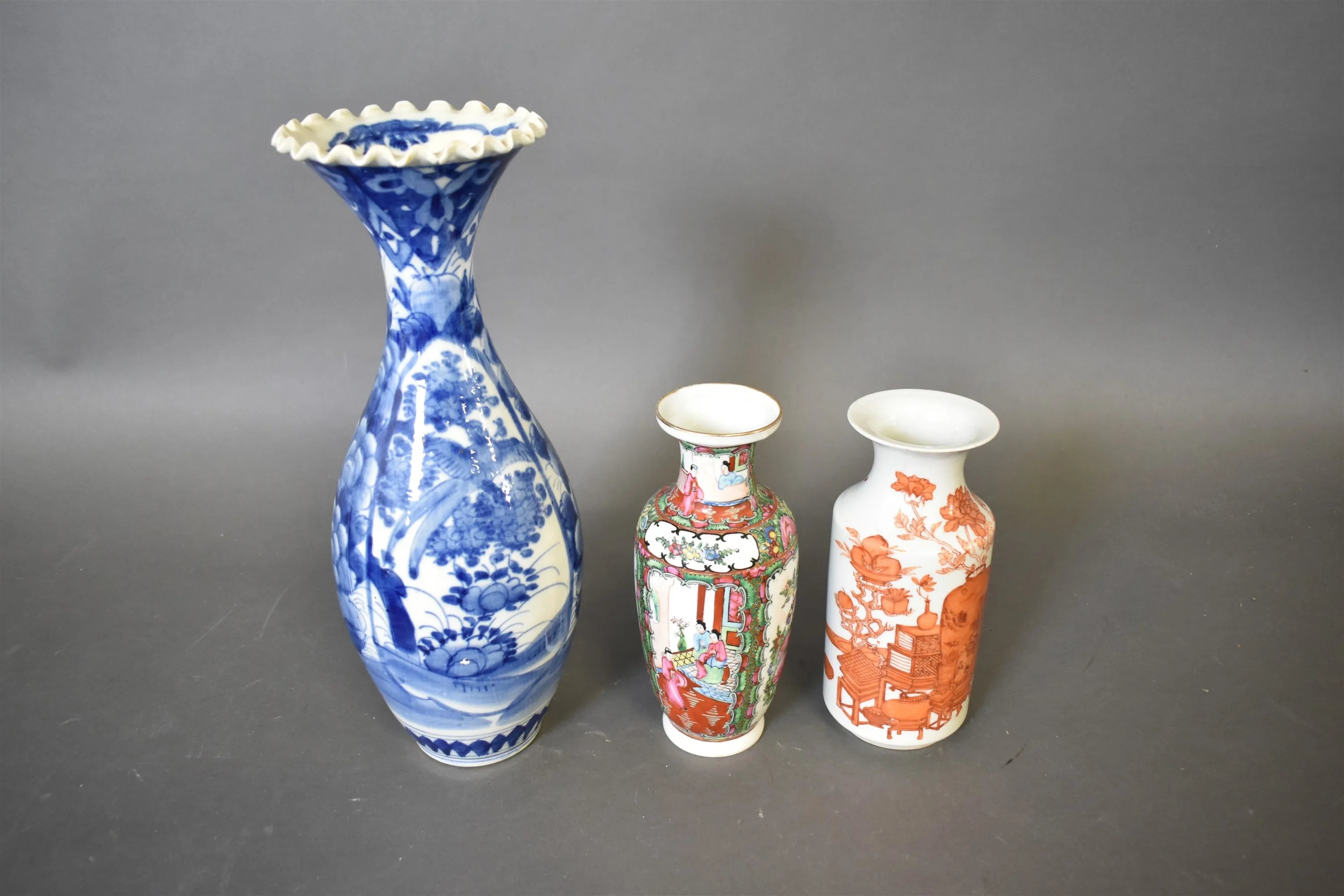 13285. Vaser 3 st Asiatisk dekor, högsta 40 cm, högsta vasen har ett nagg